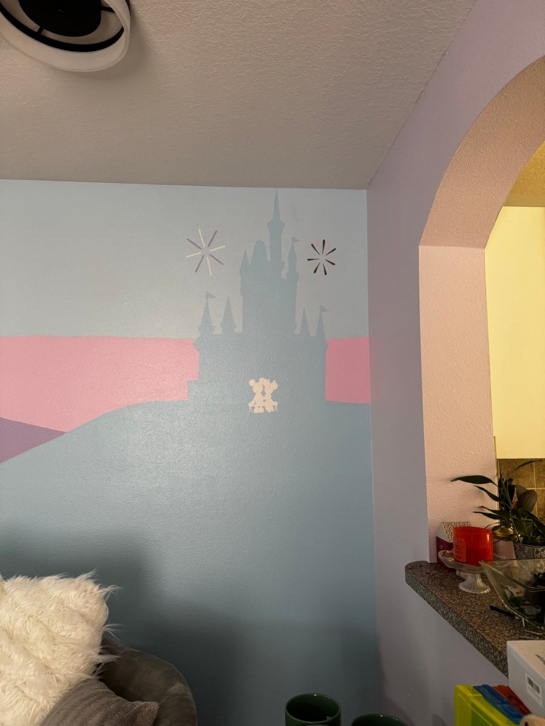Hello again! If you were with us last week you’ll know that I had to put off doing home projects because I was trying to finish a sweater for Friday the 30th. While I did try to do that, it didn’t really work out that way. Mostly I just cleaned our house, and my mom and step-dad brought over a new bedroom set. But the big thing we started doing was painting a mural at my mom’s new house! We all love Disney, so here’s the beginning phase of her Disney mural!