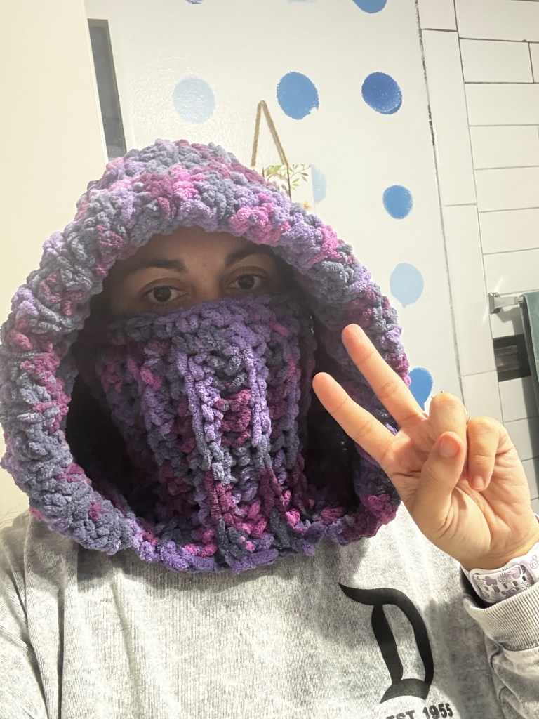 I’m sad to say that like most of my projects I take on with a deadline (I know, I should stop making deadlines for myself when it comes to crochet or knit), I was not able to finish the sweater I was working on before today. But I will still be working on it and I’ll just keep it for myself. However, once I realized there was no possible way I could finish the sweater without also allowing the house to go to sh!t (because of the three tornadoes that live here), I crocheted 2 balaclavas. The sweater was meant for our trip to New York, that we’re currently on a flight for (yes I wrote this the night before). I meant to give the sweater to Tom Felton. But realized that we also needed more coverage because it’s going to be SO COLD! So balaclavas for us instead ❤