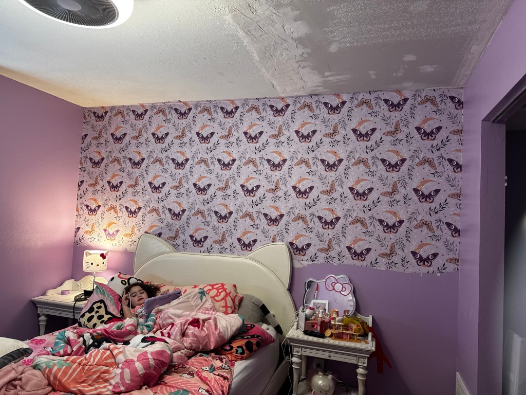 This week I FINALLY put up the wallpaper in L’s room. I still have to finish cutting the excess and putting up the divider piece that will separate the wallpaper from the bottom. I also still have to finish the roof or do something with it, so please excuse the roof when you see the picture!